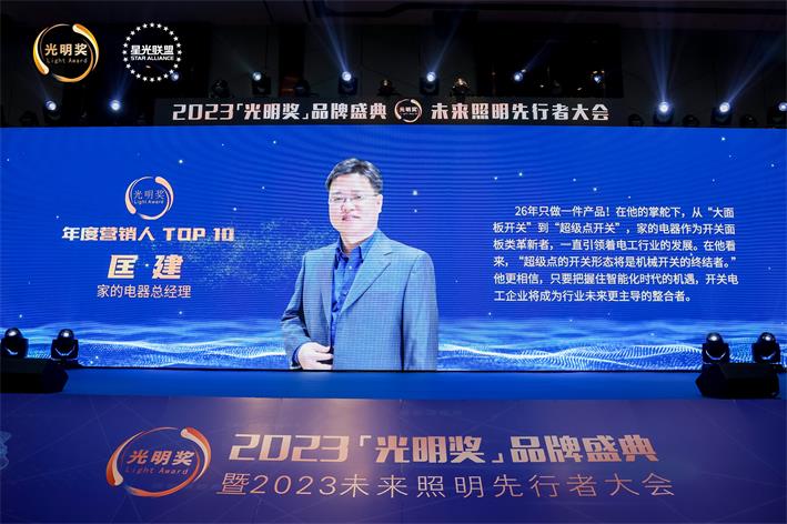 12月20日,2023“光明獎”中國照明燈飾行業年度品牌大會,于中山古鎮盛大召開!會議現場揭曉了多個獎項,其中,中山市家的電器有限公司斬獲“電工品牌TOP10”、“年度營銷人TOP10”兩大榮譽!
